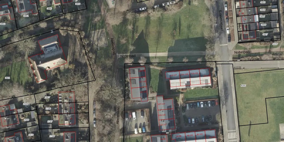 Het perceel waarop Erasmuslaan 139 staat heeft een oppervlakte van 8405 m². Dit is een zeer groot perceel. De perceeloppervlakte wordt geregistreerd door het Kadaster. Gedetailleerde informatie over de maten van dit perceel kunt u vinden in het rapport Kadastrale kaart met maatvoering van Erasmuslaan 139.