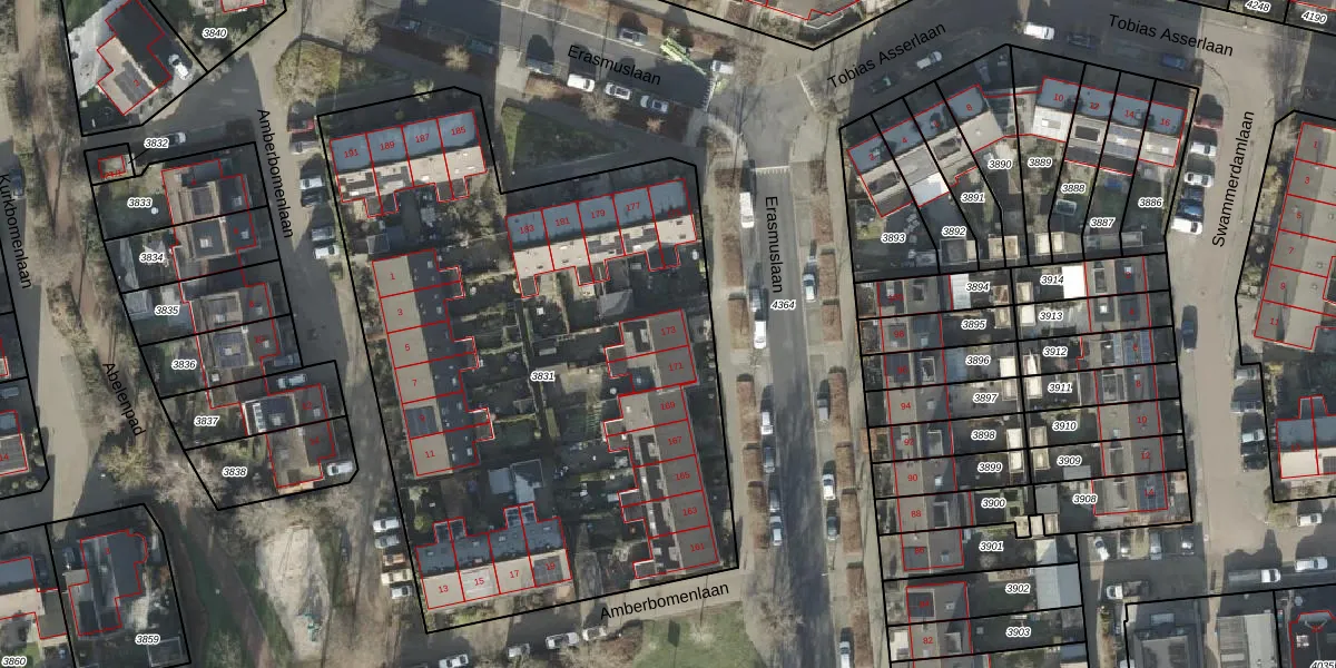 Het perceel waarop Erasmuslaan 173 staat heeft een oppervlakte van 3565 m². Dit is een zeer groot perceel. De perceeloppervlakte wordt geregistreerd door het Kadaster. Gedetailleerde informatie over de maten van dit perceel kunt u vinden in het rapport Kadastrale kaart met maatvoering van Erasmuslaan 173.