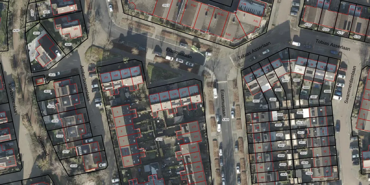 Het perceel waarop Erasmuslaan 177 staat heeft een oppervlakte van 3565 m². Dit is een zeer groot perceel. De perceeloppervlakte wordt geregistreerd door het Kadaster. Gedetailleerde informatie over de maten van dit perceel kunt u vinden in het rapport Kadastrale kaart met maatvoering van Erasmuslaan 177.