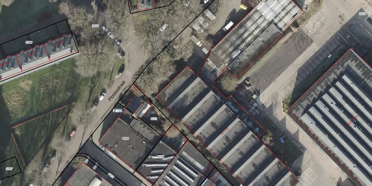Het perceel waarop Floresstraat 21 staat heeft een oppervlakte van 5,3 ha. Dit is een zeer groot perceel. De perceeloppervlakte wordt geregistreerd door het Kadaster. Gedetailleerde informatie over de maten van dit perceel kunt u vinden in het rapport Kadastrale kaart met maatvoering van Floresstraat 21.