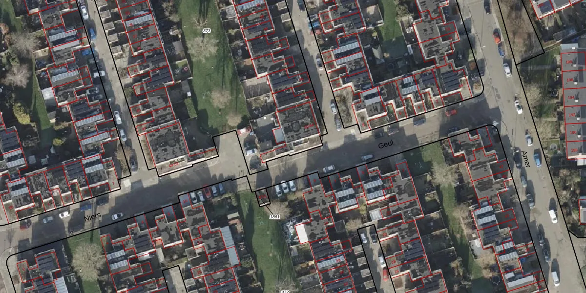 Het perceel waarop Geul 54 staat heeft een oppervlakte van 1,5 ha. Dit is een zeer groot perceel. De perceeloppervlakte wordt geregistreerd door het Kadaster. Gedetailleerde informatie over de maten van dit perceel kunt u vinden in het rapport Kadastrale kaart met maatvoering van Geul 54.