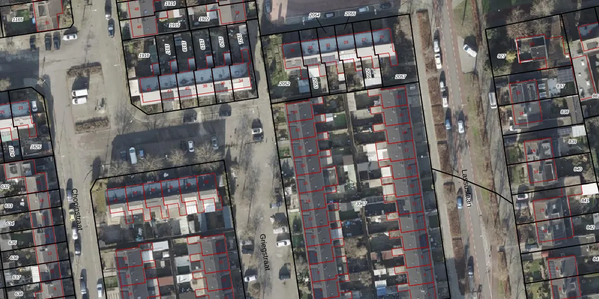 Het perceel waarop Griegstraat 20 staat heeft een oppervlakte van 3738 m². Dit is een zeer groot perceel. De perceeloppervlakte wordt geregistreerd door het Kadaster. Gedetailleerde informatie over de maten van dit perceel kunt u vinden in het rapport Kadastrale kaart met maatvoering van Griegstraat 20.