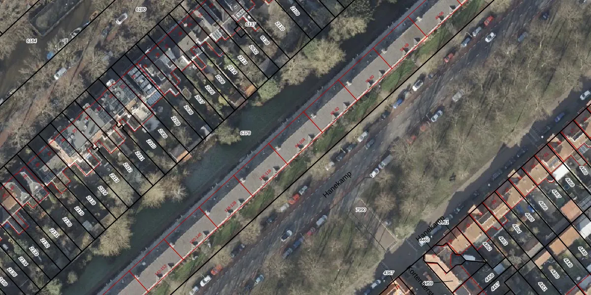 Het perceel waarop Hanekamp 102 staat heeft een oppervlakte van 7978 m². Dit is een zeer groot perceel. De perceeloppervlakte wordt geregistreerd door het Kadaster. Gedetailleerde informatie over de maten van dit perceel kunt u vinden in het rapport Kadastrale kaart met maatvoering van Hanekamp 102.