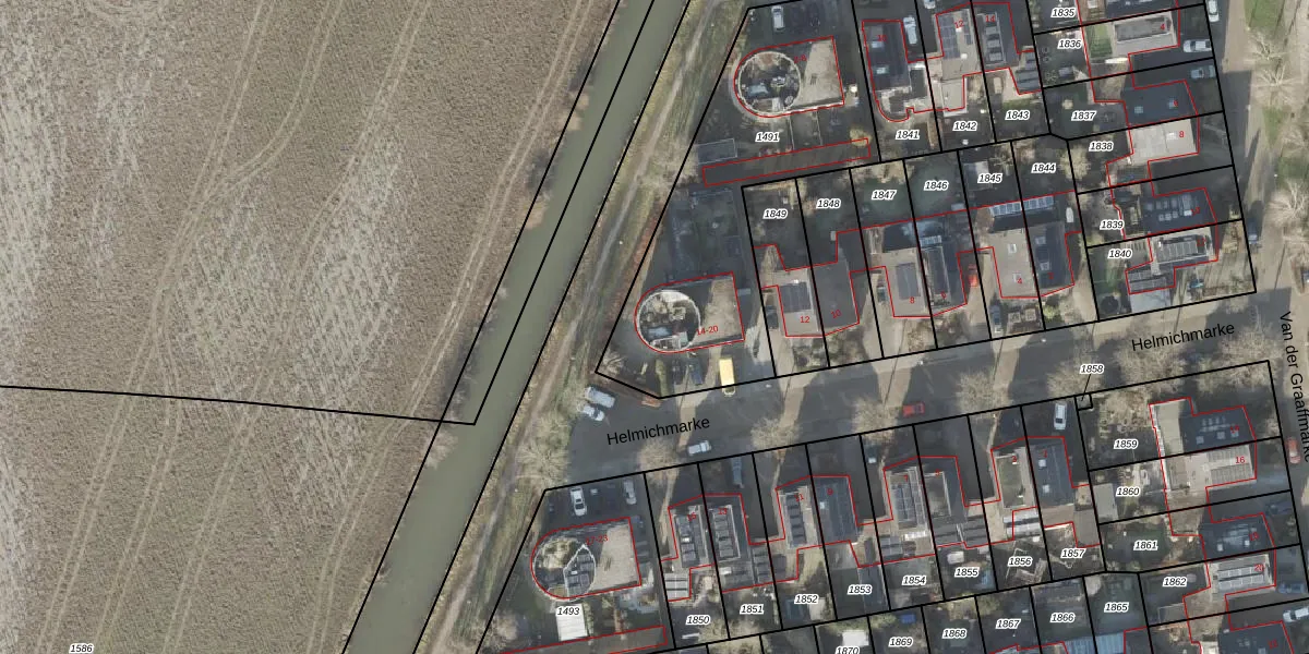 Het perceel waarop Helmichmarke 20 staat heeft een oppervlakte van 1235 m². Dit is een zeer groot perceel. De perceeloppervlakte wordt geregistreerd door het Kadaster. Gedetailleerde informatie over de maten van dit perceel kunt u vinden in het rapport Kadastrale kaart met maatvoering van Helmichmarke 20.