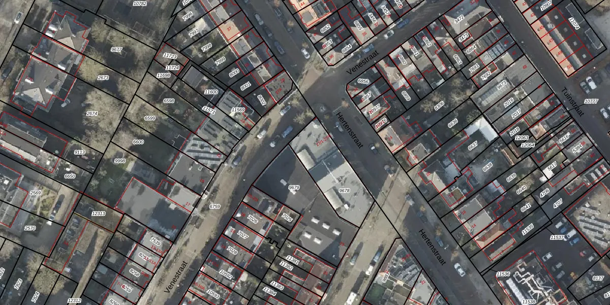 Het perceel waarop Hertenstraat 27-21 staat heeft een oppervlakte van 443 m². Dit is een groot perceel. De perceeloppervlakte wordt geregistreerd door het Kadaster. Gedetailleerde informatie over de maten van dit perceel kunt u vinden in het rapport Kadastrale kaart met maatvoering van Hertenstraat 27-21.