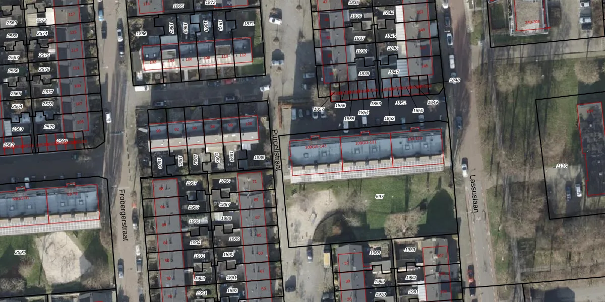 Het perceel waarop Lassuslaan 141 staat heeft een oppervlakte van 2104 m². Dit is een zeer groot perceel. De perceeloppervlakte wordt geregistreerd door het Kadaster. Gedetailleerde informatie over de maten van dit perceel kunt u vinden in het rapport Kadastrale kaart met maatvoering van Lassuslaan 141.