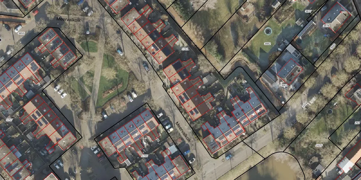 Het perceel waarop Meervalkolk 41 staat heeft een oppervlakte van 4114 m². Dit is een zeer groot perceel. De perceeloppervlakte wordt geregistreerd door het Kadaster. Gedetailleerde informatie over de maten van dit perceel kunt u vinden in het rapport Kadastrale kaart met maatvoering van Meervalkolk 41.