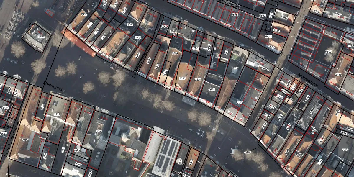 Het perceel waarop Melkmarkt 36 staat heeft een oppervlakte van 189 m². Dit is een middelgroot perceel. De perceeloppervlakte wordt geregistreerd door het Kadaster. Gedetailleerde informatie over de maten van dit perceel kunt u vinden in het rapport Kadastrale kaart met maatvoering van Melkmarkt 36.