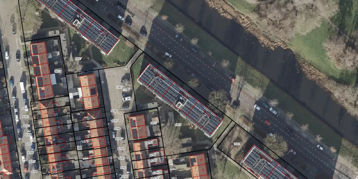 Het perceel waarop Middelweg 173-A staat heeft een oppervlakte van 1643 m². Dit is een zeer groot perceel. De perceeloppervlakte wordt geregistreerd door het Kadaster. Gedetailleerde informatie over de maten van dit perceel kunt u vinden in het rapport Kadastrale kaart met maatvoering van Middelweg 173-A.