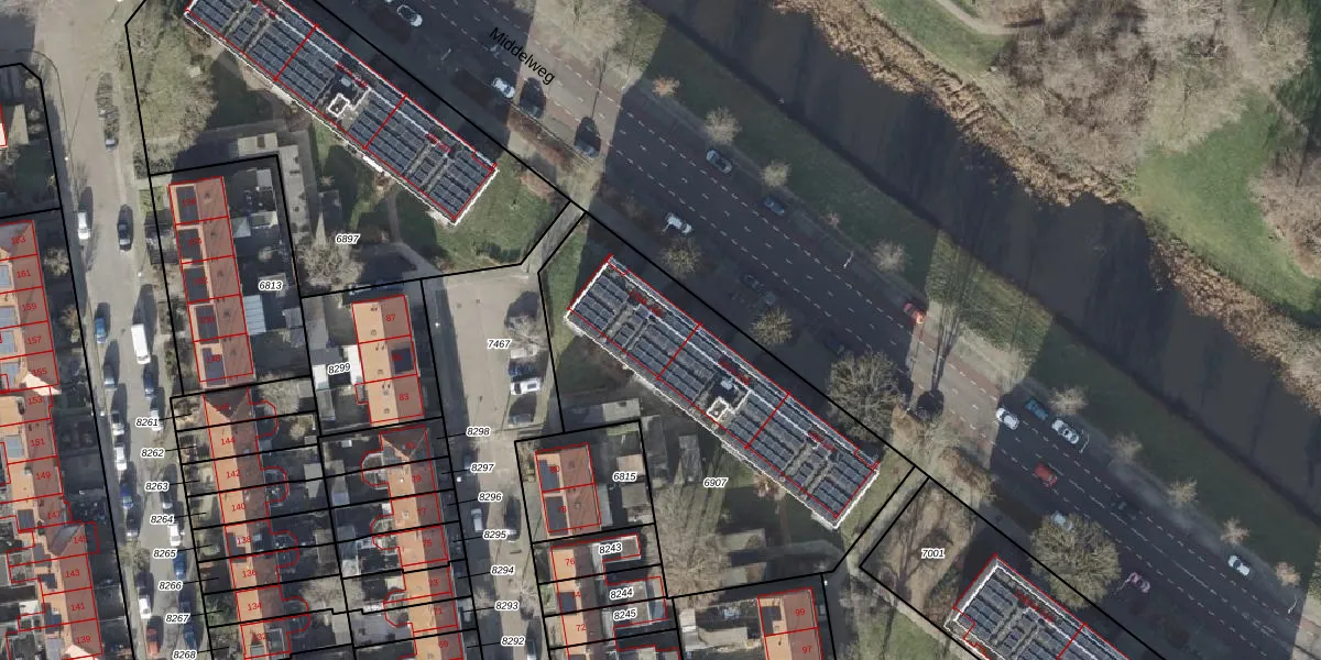 Het perceel waarop Middelweg 183 staat heeft een oppervlakte van 1643 m². Dit is een zeer groot perceel. De perceeloppervlakte wordt geregistreerd door het Kadaster. Gedetailleerde informatie over de maten van dit perceel kunt u vinden in het rapport Kadastrale kaart met maatvoering van Middelweg 183.