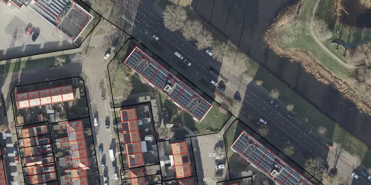 Het perceel waarop Middelweg 207 staat heeft een oppervlakte van 1916 m². Dit is een zeer groot perceel. De perceeloppervlakte wordt geregistreerd door het Kadaster. Gedetailleerde informatie over de maten van dit perceel kunt u vinden in het rapport Kadastrale kaart met maatvoering van Middelweg 207.