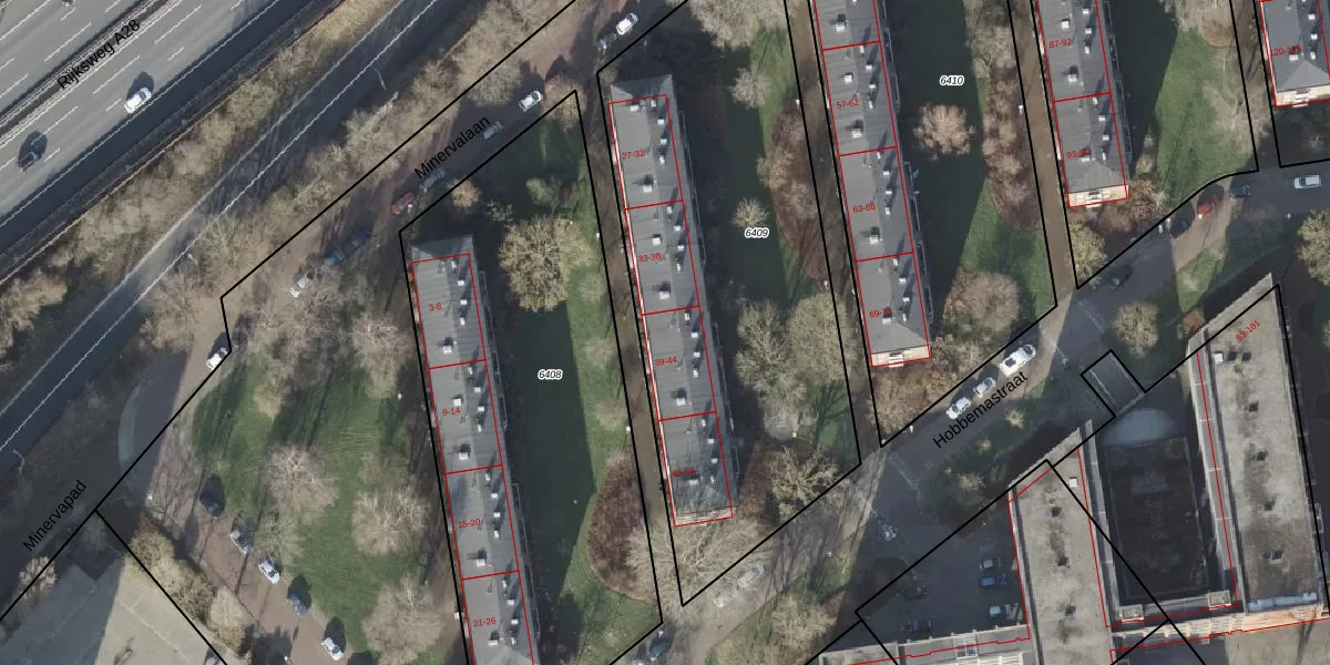 Het perceel waarop Minervalaan 40 staat heeft een oppervlakte van 2410 m². Dit is een zeer groot perceel. De perceeloppervlakte wordt geregistreerd door het Kadaster. Gedetailleerde informatie over de maten van dit perceel kunt u vinden in het rapport Kadastrale kaart met maatvoering van Minervalaan 40.