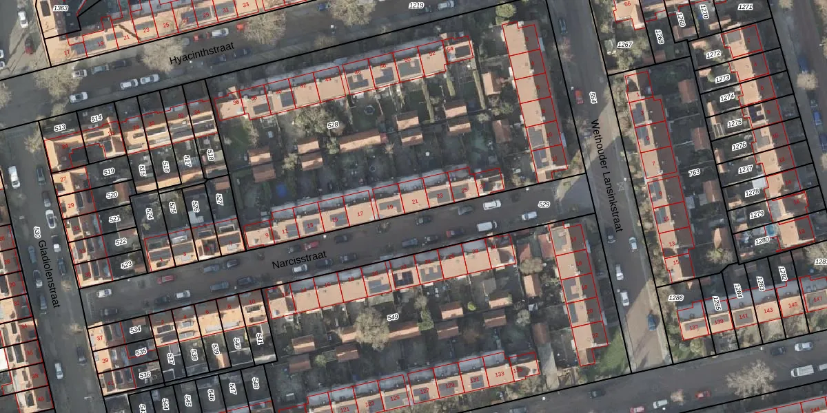 Het perceel waarop Narcisstraat 21 staat heeft een oppervlakte van 3689 m². Dit is een zeer groot perceel. De perceeloppervlakte wordt geregistreerd door het Kadaster. Gedetailleerde informatie over de maten van dit perceel kunt u vinden in het rapport Kadastrale kaart met maatvoering van Narcisstraat 21.