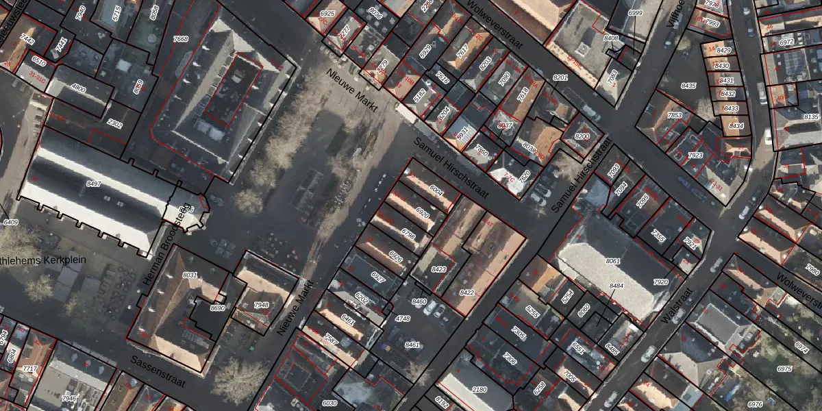 Het perceel waarop Nieuwe Markt 13-A staat heeft een oppervlakte van 97 m². Dit is een klein perceel. De perceeloppervlakte wordt geregistreerd door het Kadaster. Gedetailleerde informatie over de maten van dit perceel kunt u vinden in het rapport Kadastrale kaart met maatvoering van Nieuwe Markt 13-A.