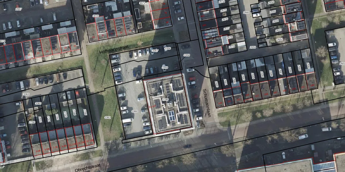 Het perceel waarop Obrechtstraat 45 staat heeft een oppervlakte van 834 m². Dit is een groot perceel. De perceeloppervlakte wordt geregistreerd door het Kadaster. Gedetailleerde informatie over de maten van dit perceel kunt u vinden in het rapport Kadastrale kaart met maatvoering van Obrechtstraat 45.