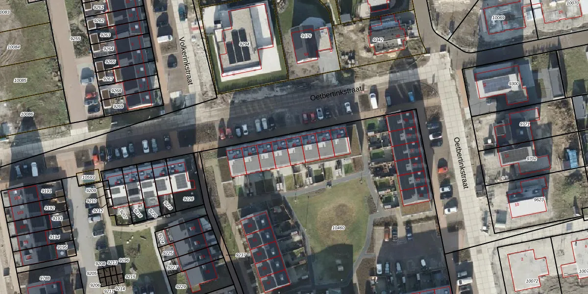 Het perceel waarop Oetbertinkstraat 39 staat heeft een oppervlakte van 5245 m². Dit is een zeer groot perceel. De perceeloppervlakte wordt geregistreerd door het Kadaster. Gedetailleerde informatie over de maten van dit perceel kunt u vinden in het rapport Kadastrale kaart met maatvoering van Oetbertinkstraat 39.