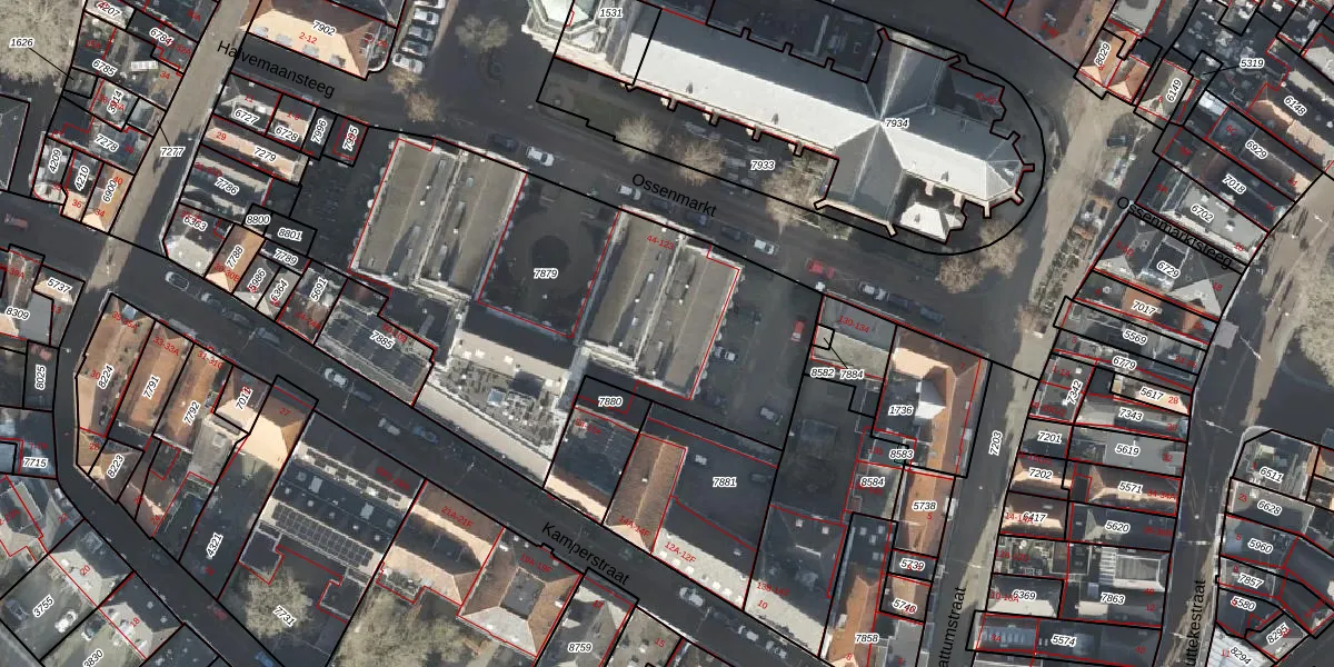 Het perceel waarop Ossenmarkt 102 staat heeft een oppervlakte van 2328 m². Dit is een zeer groot perceel. De perceeloppervlakte wordt geregistreerd door het Kadaster. Gedetailleerde informatie over de maten van dit perceel kunt u vinden in het rapport Kadastrale kaart met maatvoering van Ossenmarkt 102.