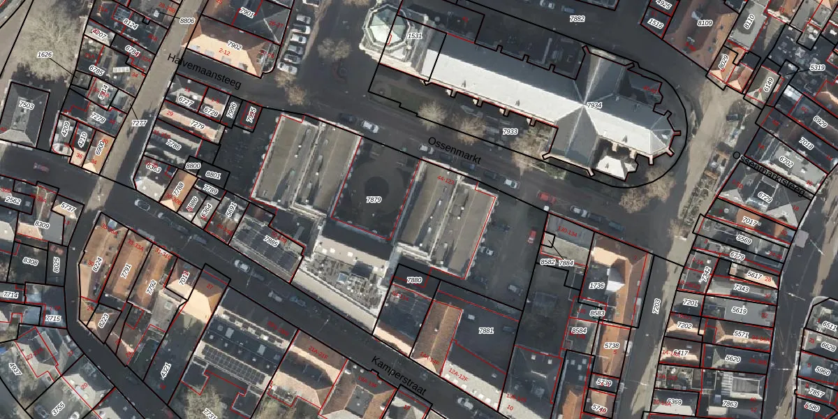 Het perceel waarop Ossenmarkt 104 staat heeft een oppervlakte van 2328 m². Dit is een zeer groot perceel. De perceeloppervlakte wordt geregistreerd door het Kadaster. Gedetailleerde informatie over de maten van dit perceel kunt u vinden in het rapport Kadastrale kaart met maatvoering van Ossenmarkt 104.