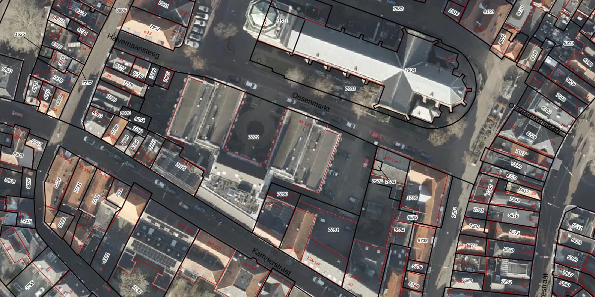 Het perceel waarop Ossenmarkt 105 staat heeft een oppervlakte van 2328 m². Dit is een zeer groot perceel. De perceeloppervlakte wordt geregistreerd door het Kadaster. Gedetailleerde informatie over de maten van dit perceel kunt u vinden in het rapport Kadastrale kaart met maatvoering van Ossenmarkt 105.