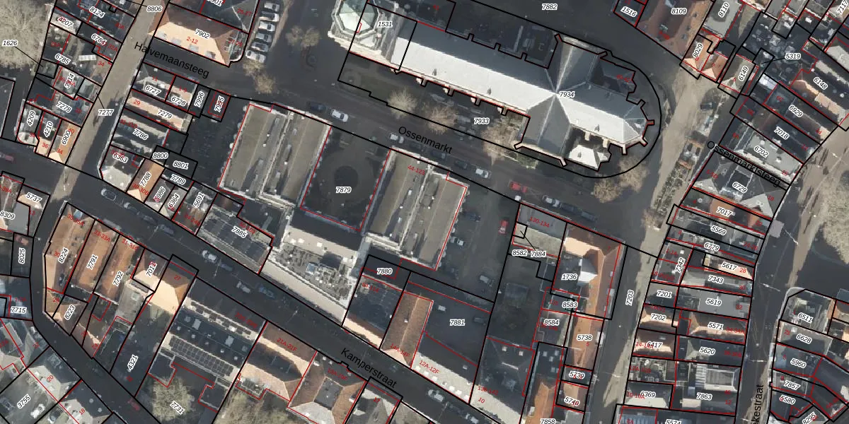 Het perceel waarop Ossenmarkt 106 staat heeft een oppervlakte van 2328 m². Dit is een zeer groot perceel. De perceeloppervlakte wordt geregistreerd door het Kadaster. Gedetailleerde informatie over de maten van dit perceel kunt u vinden in het rapport Kadastrale kaart met maatvoering van Ossenmarkt 106.