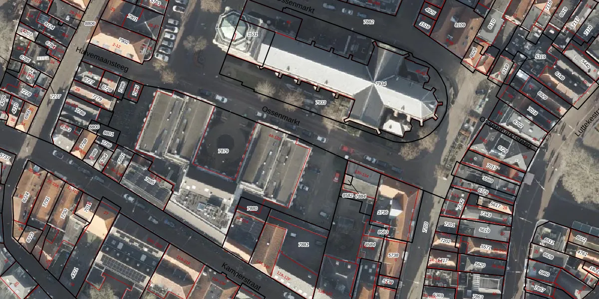 Het perceel waarop Ossenmarkt 119 staat heeft een oppervlakte van 2328 m². Dit is een zeer groot perceel. De perceeloppervlakte wordt geregistreerd door het Kadaster. Gedetailleerde informatie over de maten van dit perceel kunt u vinden in het rapport Kadastrale kaart met maatvoering van Ossenmarkt 119.