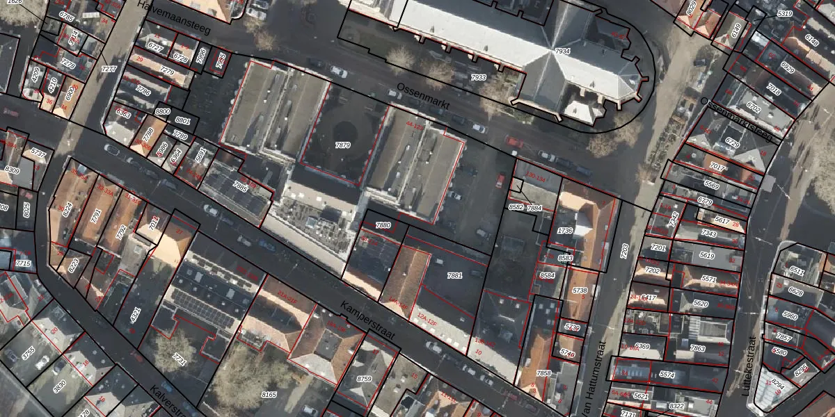 Het perceel waarop Ossenmarkt 123 staat heeft een oppervlakte van 2328 m². Dit is een zeer groot perceel. De perceeloppervlakte wordt geregistreerd door het Kadaster. Gedetailleerde informatie over de maten van dit perceel kunt u vinden in het rapport Kadastrale kaart met maatvoering van Ossenmarkt 123.