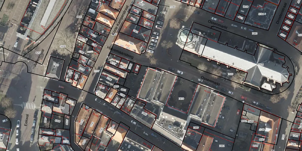 Het perceel waarop Ossenmarkt 44 staat heeft een oppervlakte van 2328 m². Dit is een zeer groot perceel. De perceeloppervlakte wordt geregistreerd door het Kadaster. Gedetailleerde informatie over de maten van dit perceel kunt u vinden in het rapport Kadastrale kaart met maatvoering van Ossenmarkt 44.