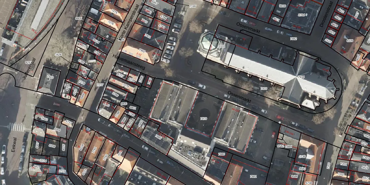 Het perceel waarop Ossenmarkt 46 staat heeft een oppervlakte van 2328 m². Dit is een zeer groot perceel. De perceeloppervlakte wordt geregistreerd door het Kadaster. Gedetailleerde informatie over de maten van dit perceel kunt u vinden in het rapport Kadastrale kaart met maatvoering van Ossenmarkt 46.