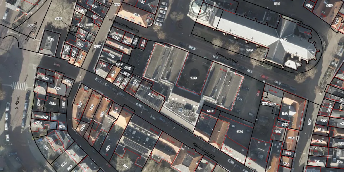 Het perceel waarop Ossenmarkt 66 staat heeft een oppervlakte van 2328 m². Dit is een zeer groot perceel. De perceeloppervlakte wordt geregistreerd door het Kadaster. Gedetailleerde informatie over de maten van dit perceel kunt u vinden in het rapport Kadastrale kaart met maatvoering van Ossenmarkt 66.