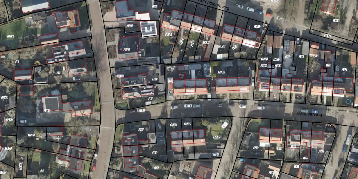 Het perceel waarop Papaverweg 1 staat heeft een oppervlakte van 1071 m². Dit is een zeer groot perceel. De perceeloppervlakte wordt geregistreerd door het Kadaster. Gedetailleerde informatie over de maten van dit perceel kunt u vinden in het rapport Kadastrale kaart met maatvoering van Papaverweg 1.
