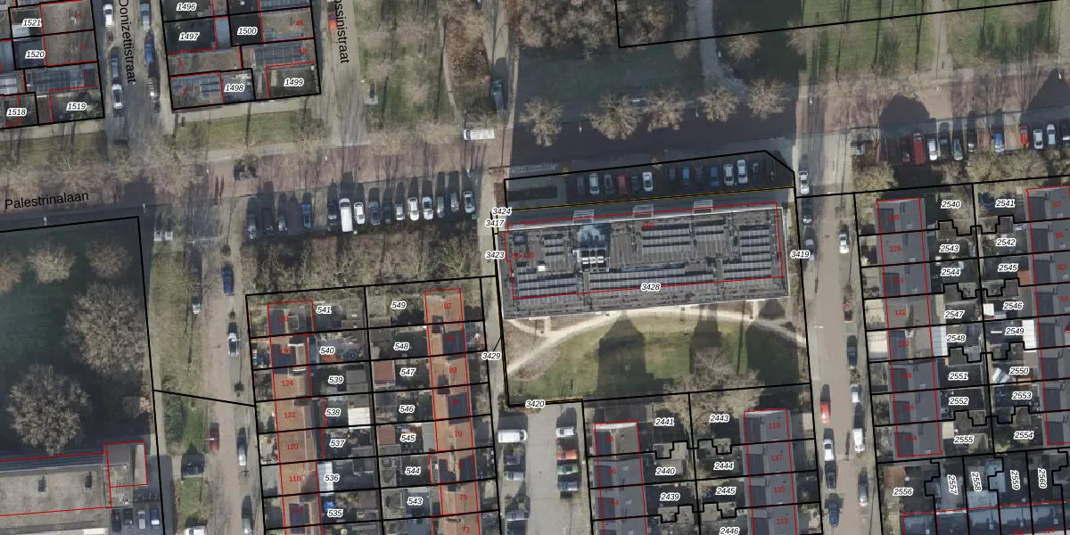 Het perceel waarop Praetoriusstraat 104 staat heeft een oppervlakte van 2087 m². Dit is een zeer groot perceel. De perceeloppervlakte wordt geregistreerd door het Kadaster. Gedetailleerde informatie over de maten van dit perceel kunt u vinden in het rapport Kadastrale kaart met maatvoering van Praetoriusstraat 104.
