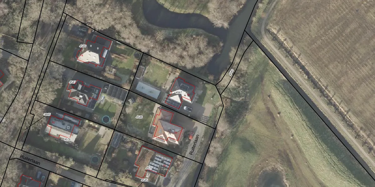Het perceel waarop Ruiterlaan 1-F staat heeft een oppervlakte van 1039 m². Dit is een zeer groot perceel. De perceeloppervlakte wordt geregistreerd door het Kadaster. Gedetailleerde informatie over de maten van dit perceel kunt u vinden in het rapport Kadastrale kaart met maatvoering van Ruiterlaan 1-F.