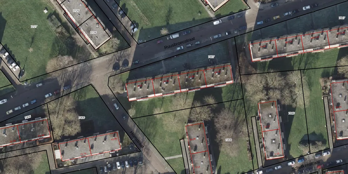 Het perceel waarop Ruusbroecstraat 32 staat heeft een oppervlakte van 2220 m². Dit is een zeer groot perceel. De perceeloppervlakte wordt geregistreerd door het Kadaster. Gedetailleerde informatie over de maten van dit perceel kunt u vinden in het rapport Kadastrale kaart met maatvoering van Ruusbroecstraat 32.