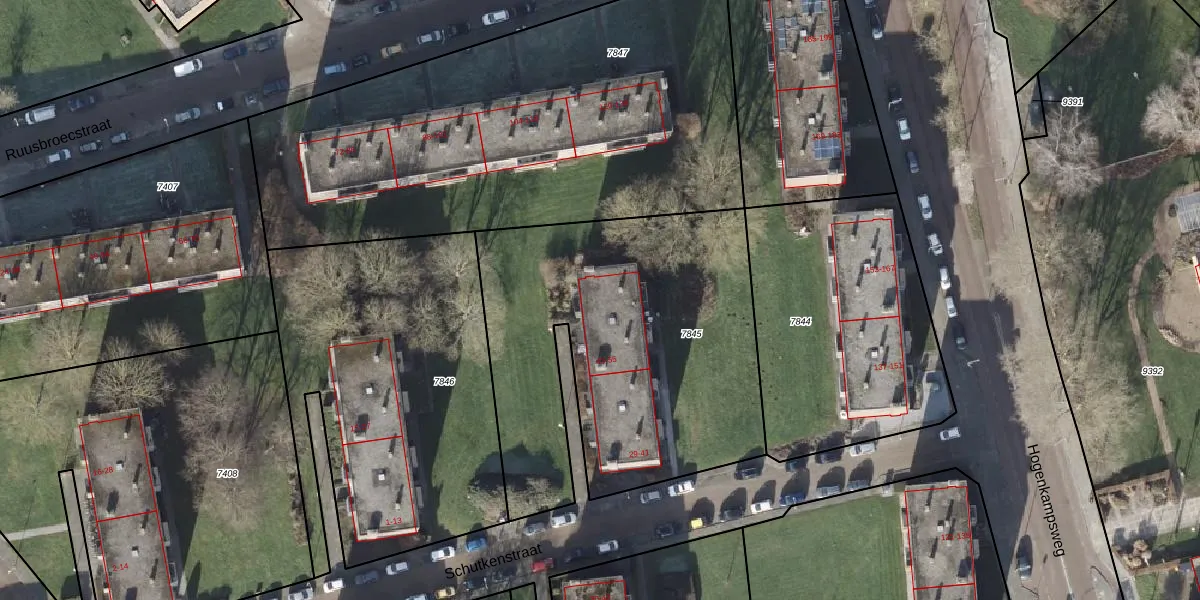Het perceel waarop Schutkenstraat 53 staat heeft een oppervlakte van 1916 m². Dit is een zeer groot perceel. De perceeloppervlakte wordt geregistreerd door het Kadaster. Gedetailleerde informatie over de maten van dit perceel kunt u vinden in het rapport Kadastrale kaart met maatvoering van Schutkenstraat 53.