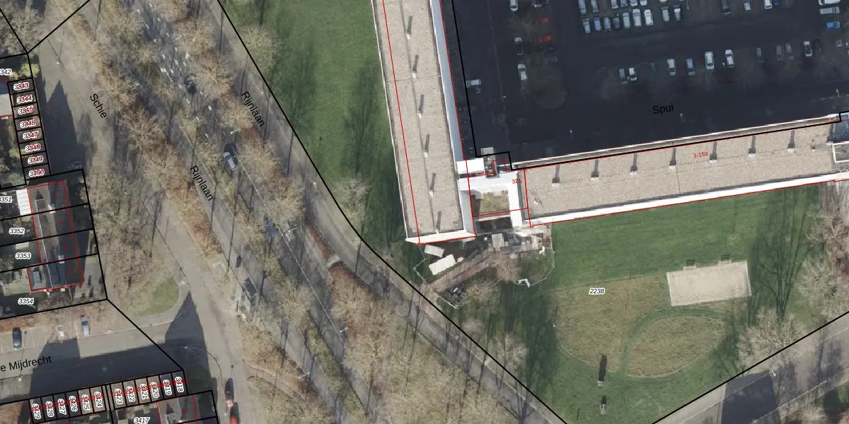 Het perceel waarop Spui 319 staat heeft een oppervlakte van 9783 m². Dit is een zeer groot perceel. De perceeloppervlakte wordt geregistreerd door het Kadaster. Gedetailleerde informatie over de maten van dit perceel kunt u vinden in het rapport Kadastrale kaart met maatvoering van Spui 319.