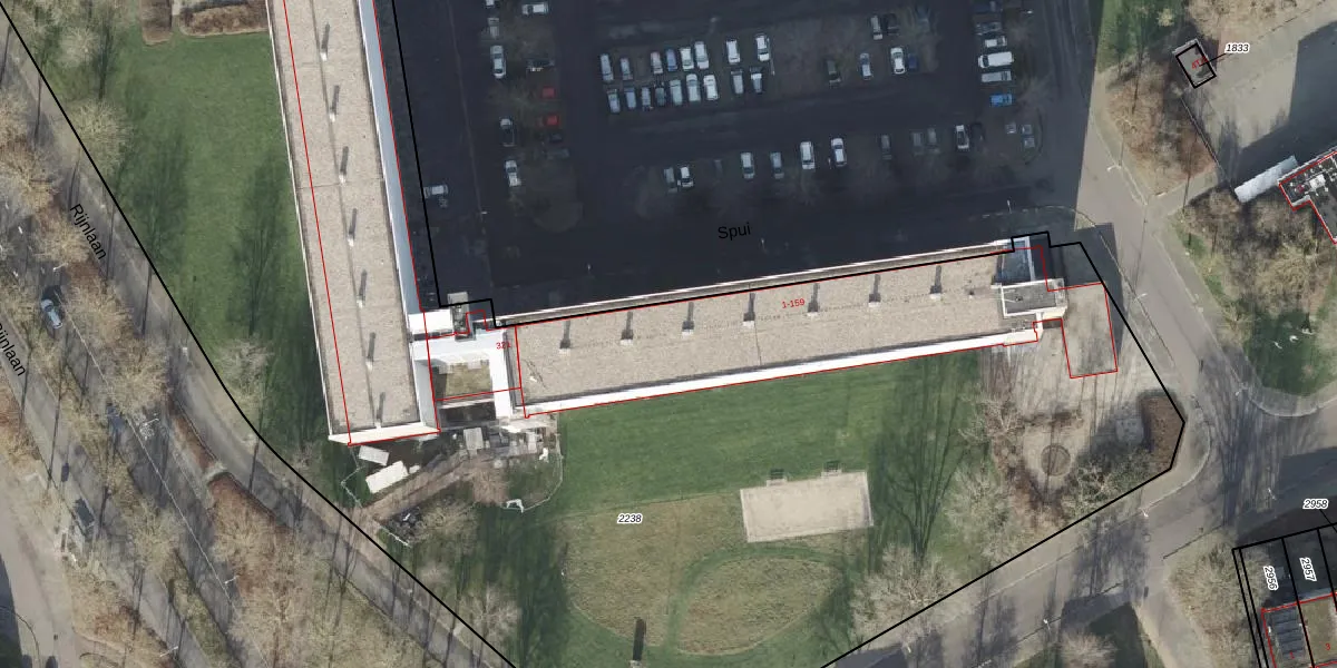 Het perceel waarop Spui 43 staat heeft een oppervlakte van 9783 m². Dit is een zeer groot perceel. De perceeloppervlakte wordt geregistreerd door het Kadaster. Gedetailleerde informatie over de maten van dit perceel kunt u vinden in het rapport Kadastrale kaart met maatvoering van Spui 43.
