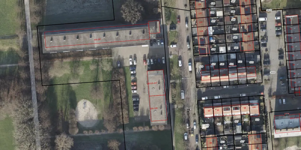 Het perceel waarop Telemannstraat 185-G-8 staat heeft een oppervlakte van 1,5 ha. Dit is een zeer groot perceel. De perceeloppervlakte wordt geregistreerd door het Kadaster. Gedetailleerde informatie over de maten van dit perceel kunt u vinden in het rapport Kadastrale kaart met maatvoering van Telemannstraat 185-G-8.