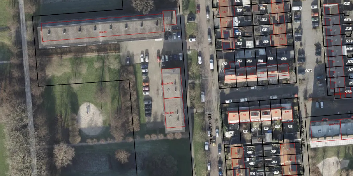 Het perceel waarop Telemannstraat 201 staat heeft een oppervlakte van 1,5 ha. Dit is een zeer groot perceel. De perceeloppervlakte wordt geregistreerd door het Kadaster. Gedetailleerde informatie over de maten van dit perceel kunt u vinden in het rapport Kadastrale kaart met maatvoering van Telemannstraat 201.