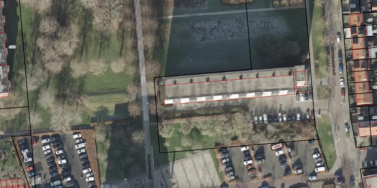 Het perceel waarop Telemannstraat 45 staat heeft een oppervlakte van 1,5 ha. Dit is een zeer groot perceel. De perceeloppervlakte wordt geregistreerd door het Kadaster. Gedetailleerde informatie over de maten van dit perceel kunt u vinden in het rapport Kadastrale kaart met maatvoering van Telemannstraat 45.