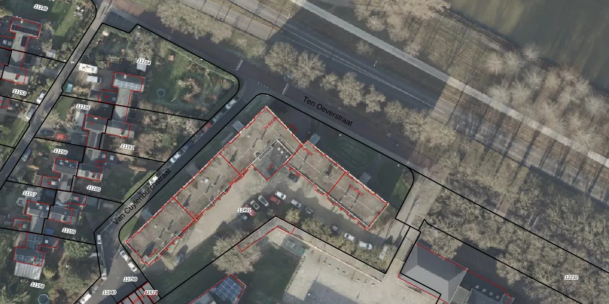 Het perceel waarop Ten Oeverstraat 40 staat heeft een oppervlakte van 3476 m². Dit is een zeer groot perceel. De perceeloppervlakte wordt geregistreerd door het Kadaster. Gedetailleerde informatie over de maten van dit perceel kunt u vinden in het rapport Kadastrale kaart met maatvoering van Ten Oeverstraat 40.