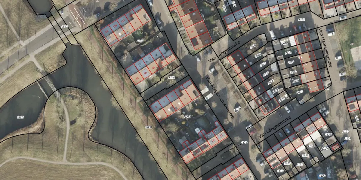 Het perceel waarop Van Langenmarke 3 staat heeft een oppervlakte van 1311 m². Dit is een zeer groot perceel. De perceeloppervlakte wordt geregistreerd door het Kadaster. Gedetailleerde informatie over de maten van dit perceel kunt u vinden in het rapport Kadastrale kaart met maatvoering van Van Langenmarke 3.