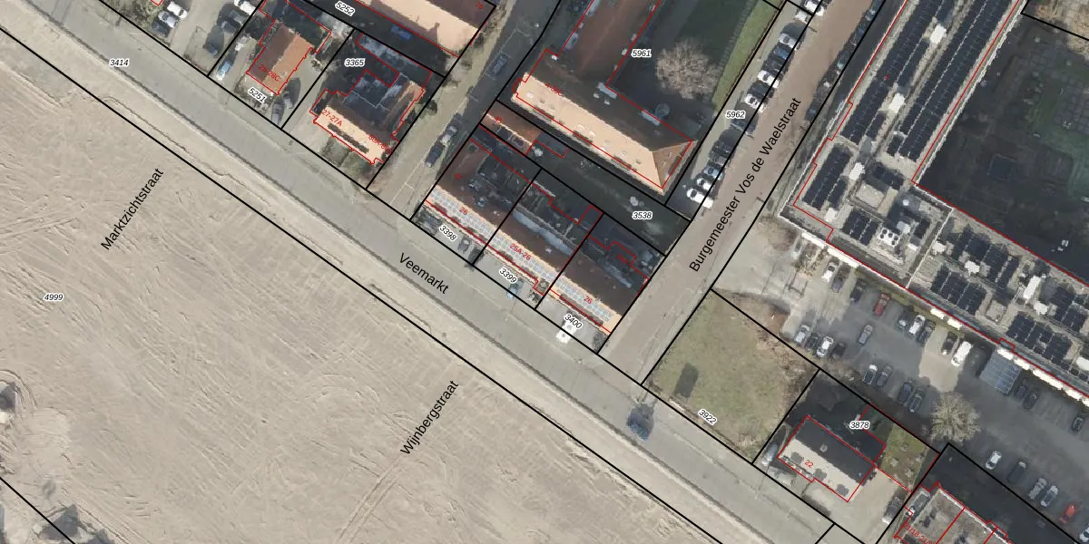 Het perceel waarop Veemarkt 25-A staat heeft een oppervlakte van 310 m². Dit is een groot perceel. De perceeloppervlakte wordt geregistreerd door het Kadaster. Gedetailleerde informatie over de maten van dit perceel kunt u vinden in het rapport Kadastrale kaart met maatvoering van Veemarkt 25-A.