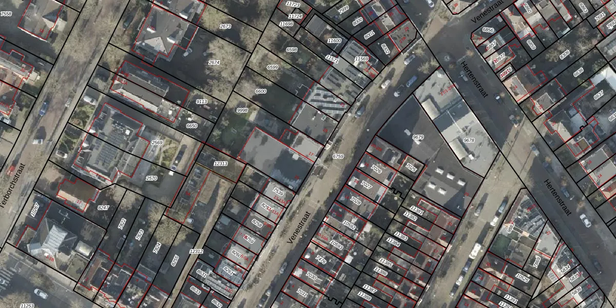 Het perceel waarop Venestraat 17 staat heeft een oppervlakte van 639 m². Dit is een groot perceel. De perceeloppervlakte wordt geregistreerd door het Kadaster. Gedetailleerde informatie over de maten van dit perceel kunt u vinden in het rapport Kadastrale kaart met maatvoering van Venestraat 17.