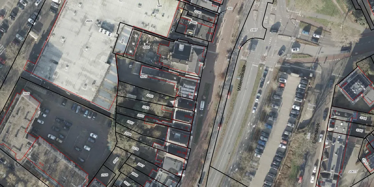 Het perceel waarop Willemskade 10-E staat heeft een oppervlakte van 585 m². Dit is een groot perceel. De perceeloppervlakte wordt geregistreerd door het Kadaster. Gedetailleerde informatie over de maten van dit perceel kunt u vinden in het rapport Kadastrale kaart met maatvoering van Willemskade 10-E.